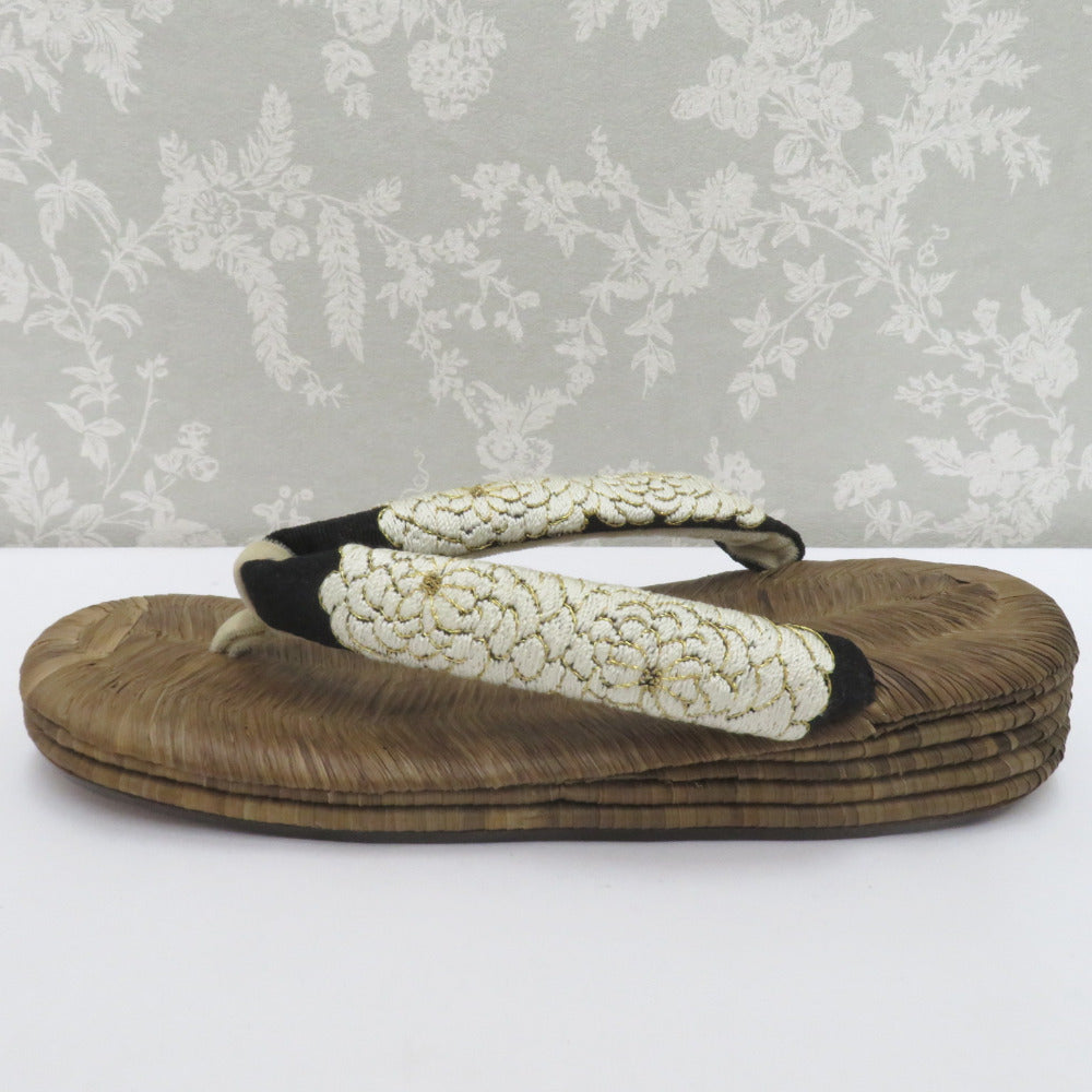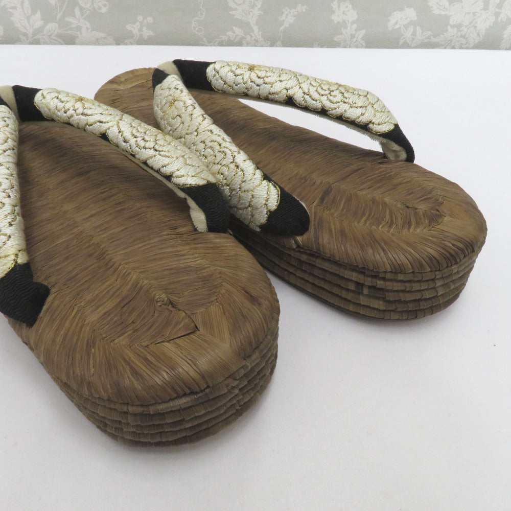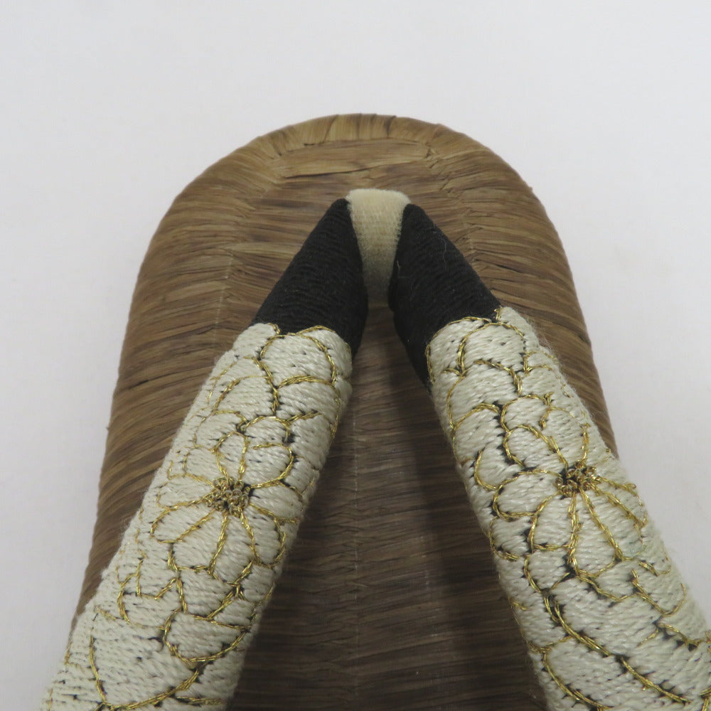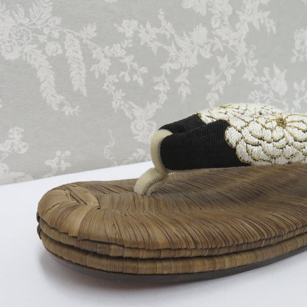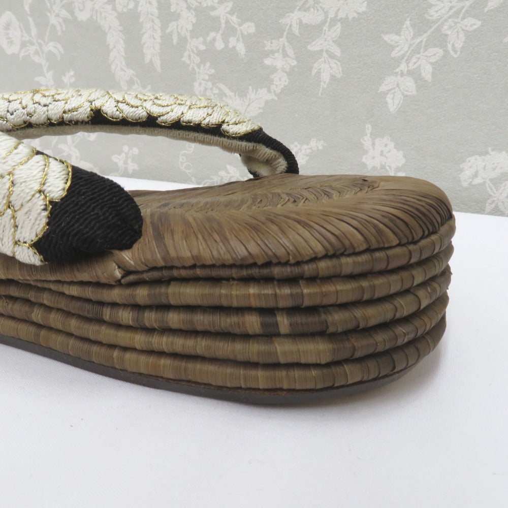草履 畳草履 畳表 ダークブラウン ブラック×オフホワイト 花刺しゅう 五段重ね 皮底 レディース 履物 高級草履