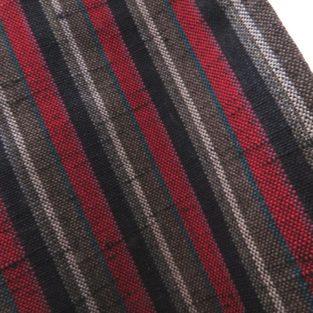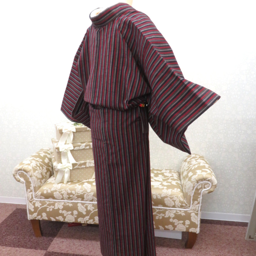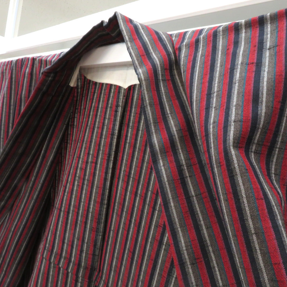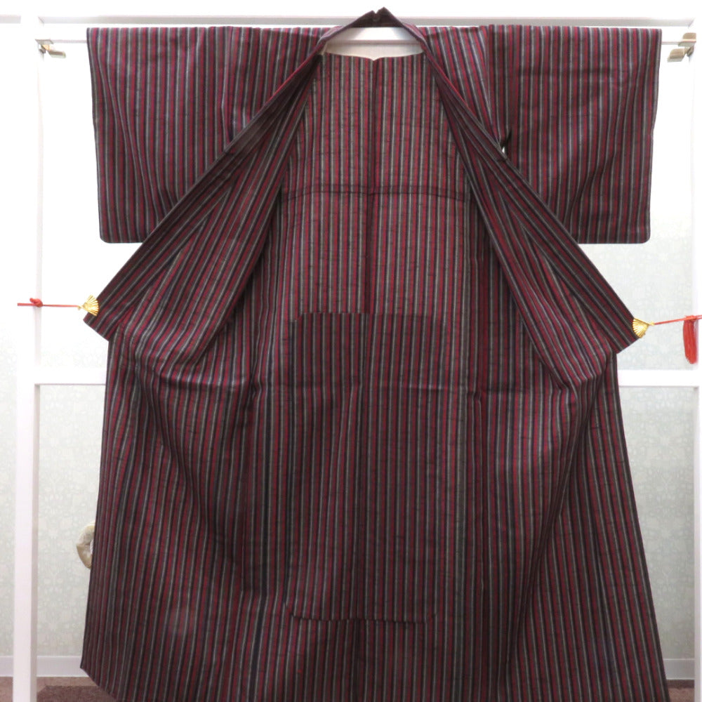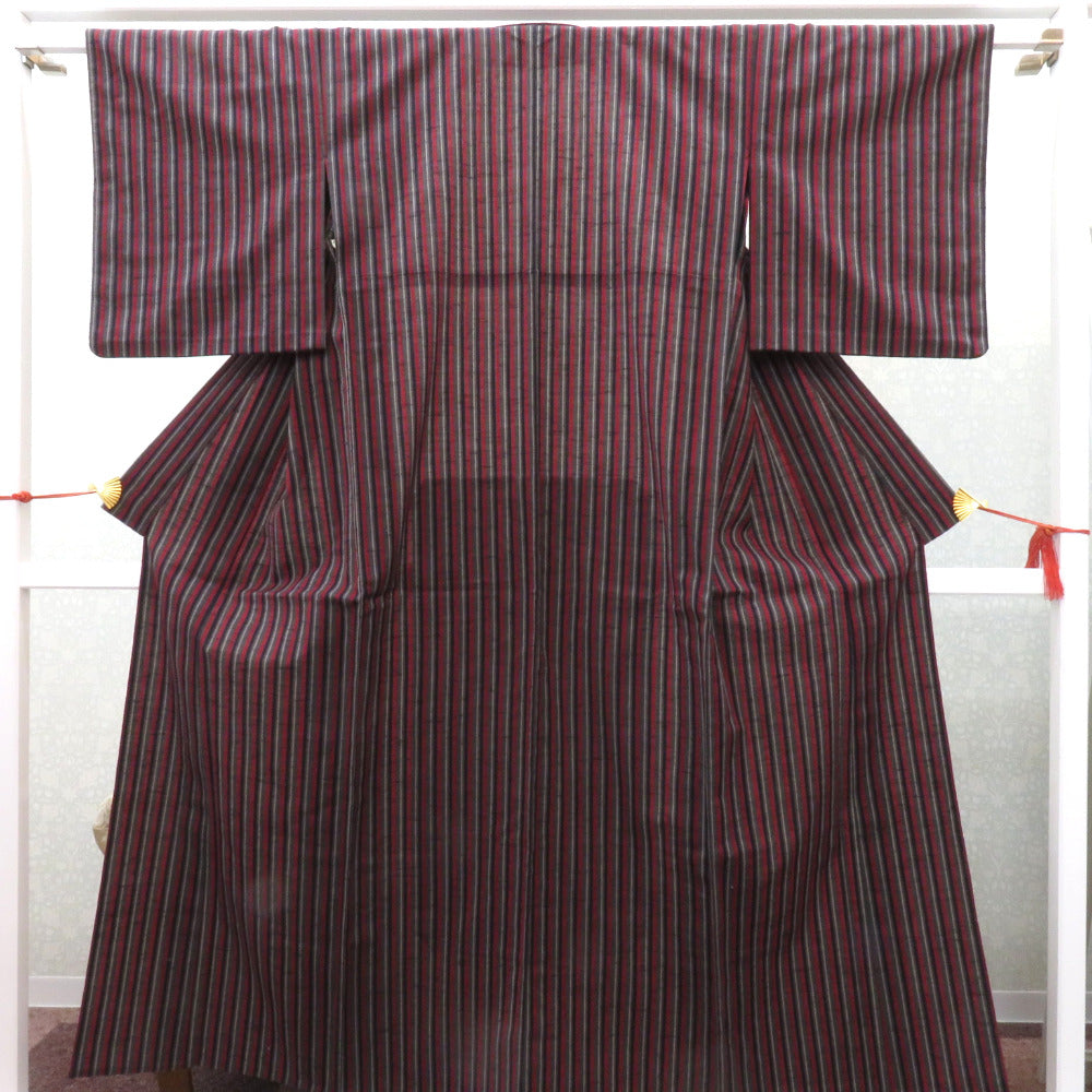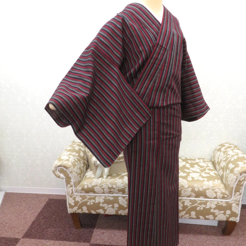 ウール着物 単衣 グレー×紺赤白緑ピンク 縞柄 バチ衿 カジュアルきもの 普段着物 仕立て上がり ウールきもの 和洋ミックス
