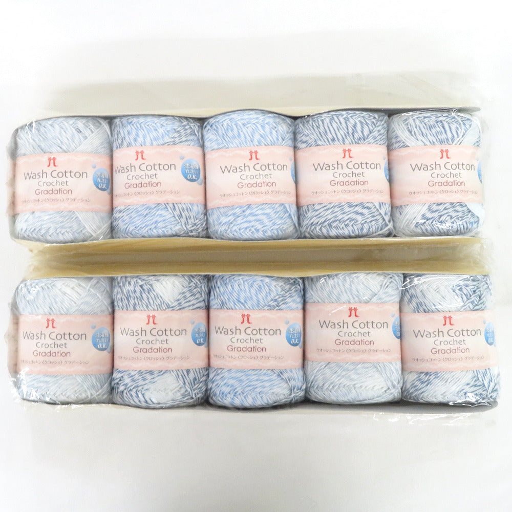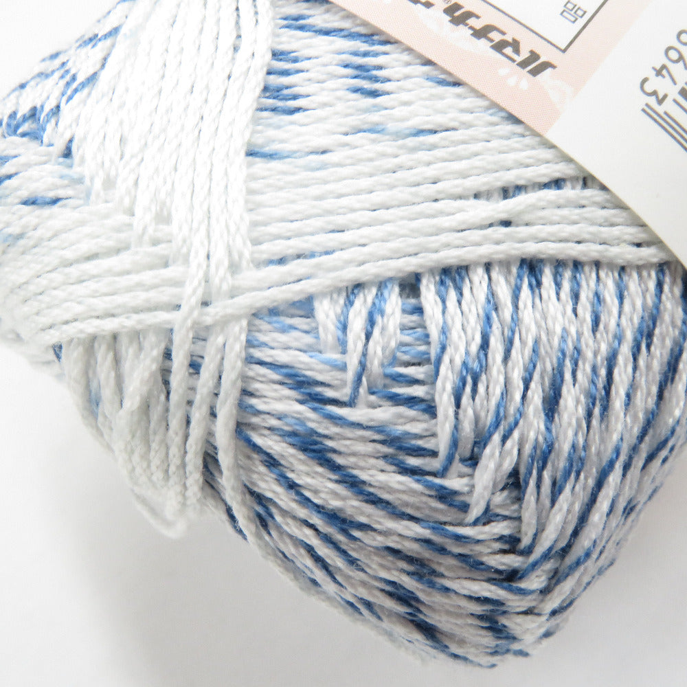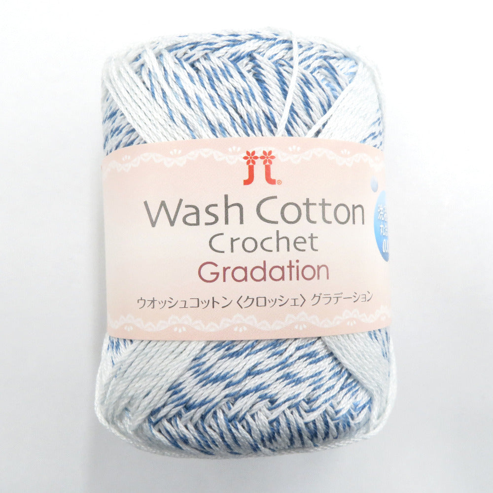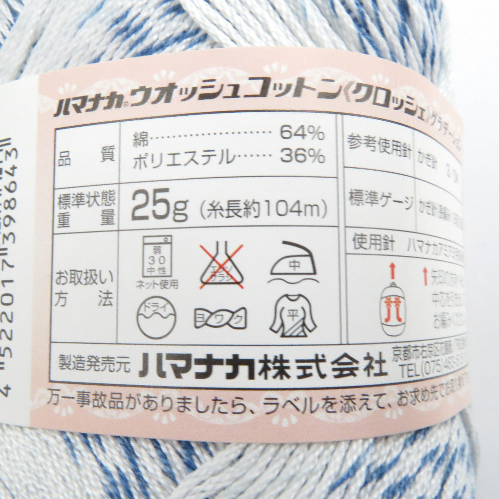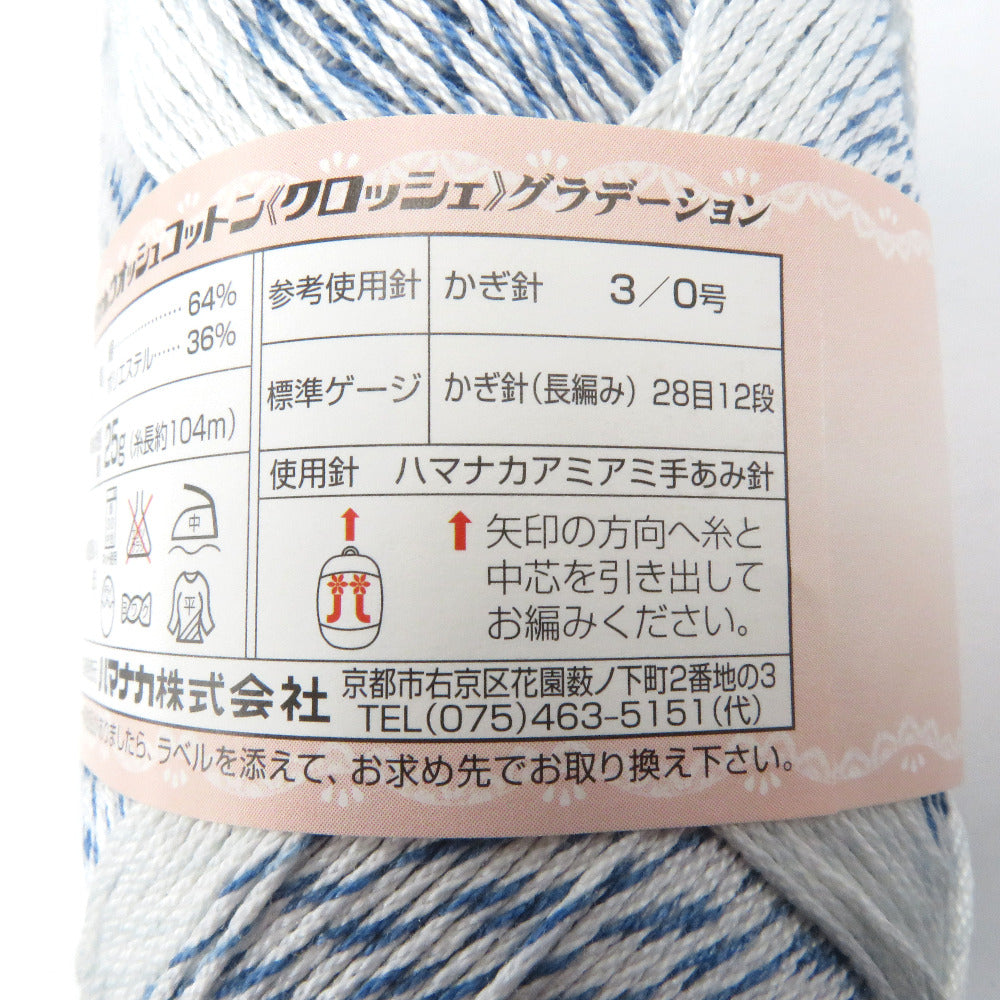 | ポリエステルとアクリルの混合糸で、約104mの長さがあり、グラデーションカラーが特徴のかぎ針用糸です。 |
