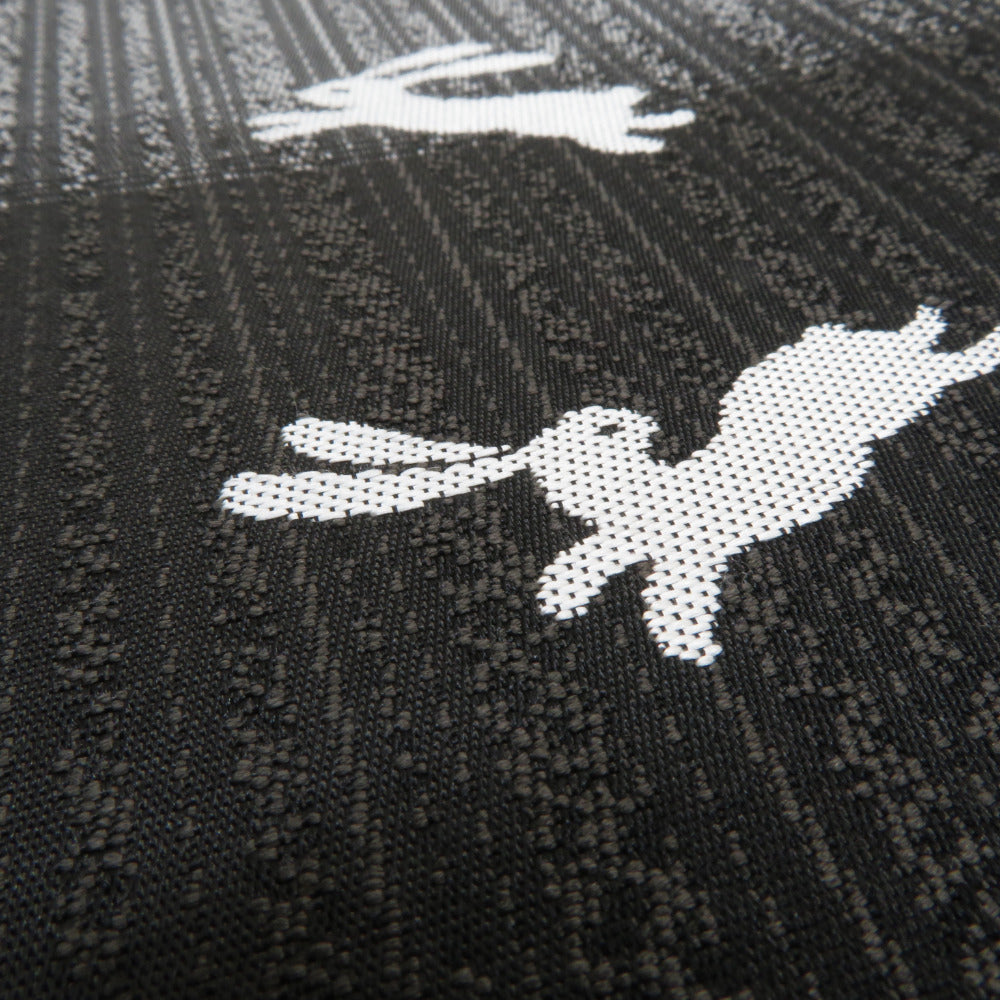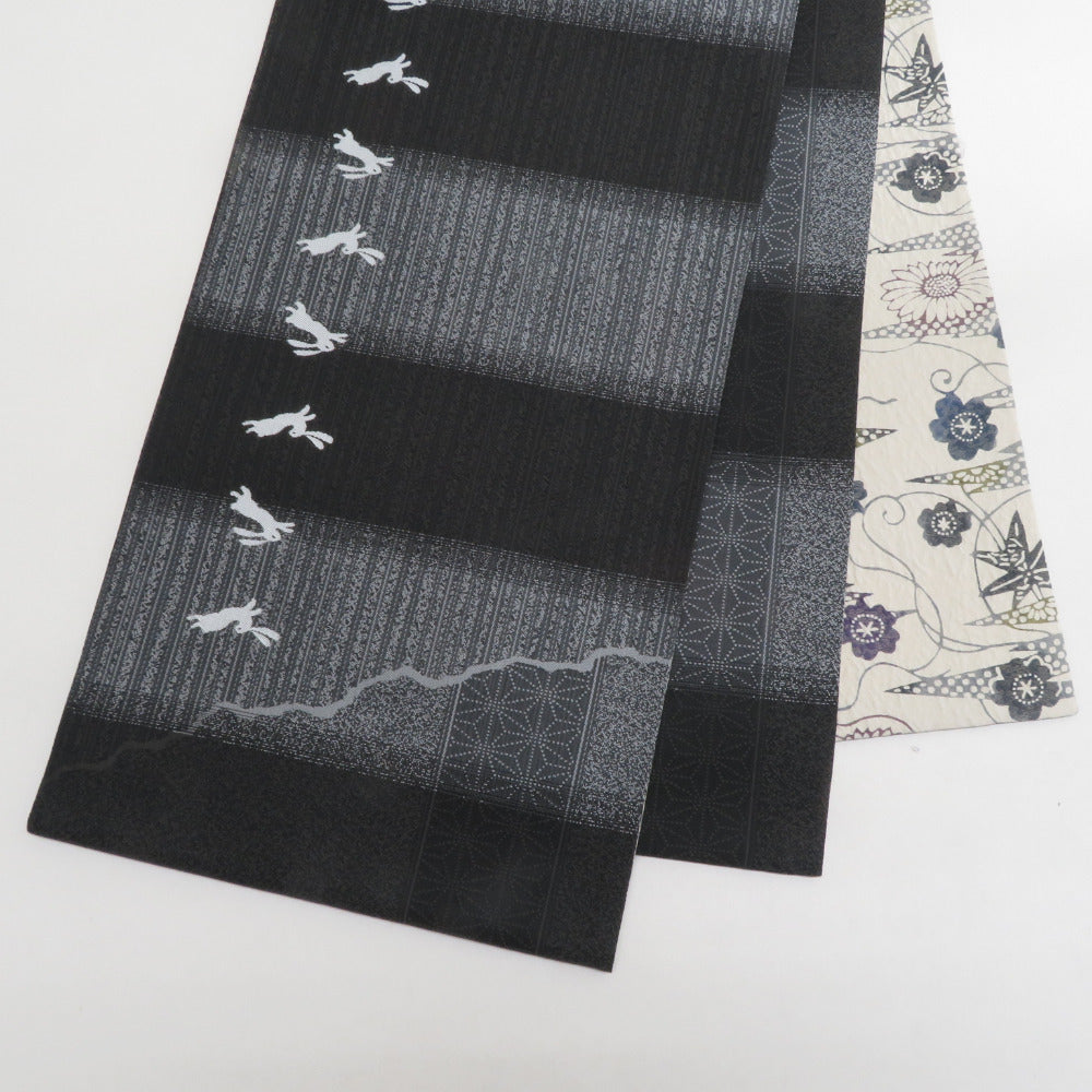 袋帯 正絹 西陣織 証紙付き 洒落袋帯 リバーシブル 六通柄 飛び兎に千松模様 裏ふくれ織り 黒色x灰色 長さ456cm
