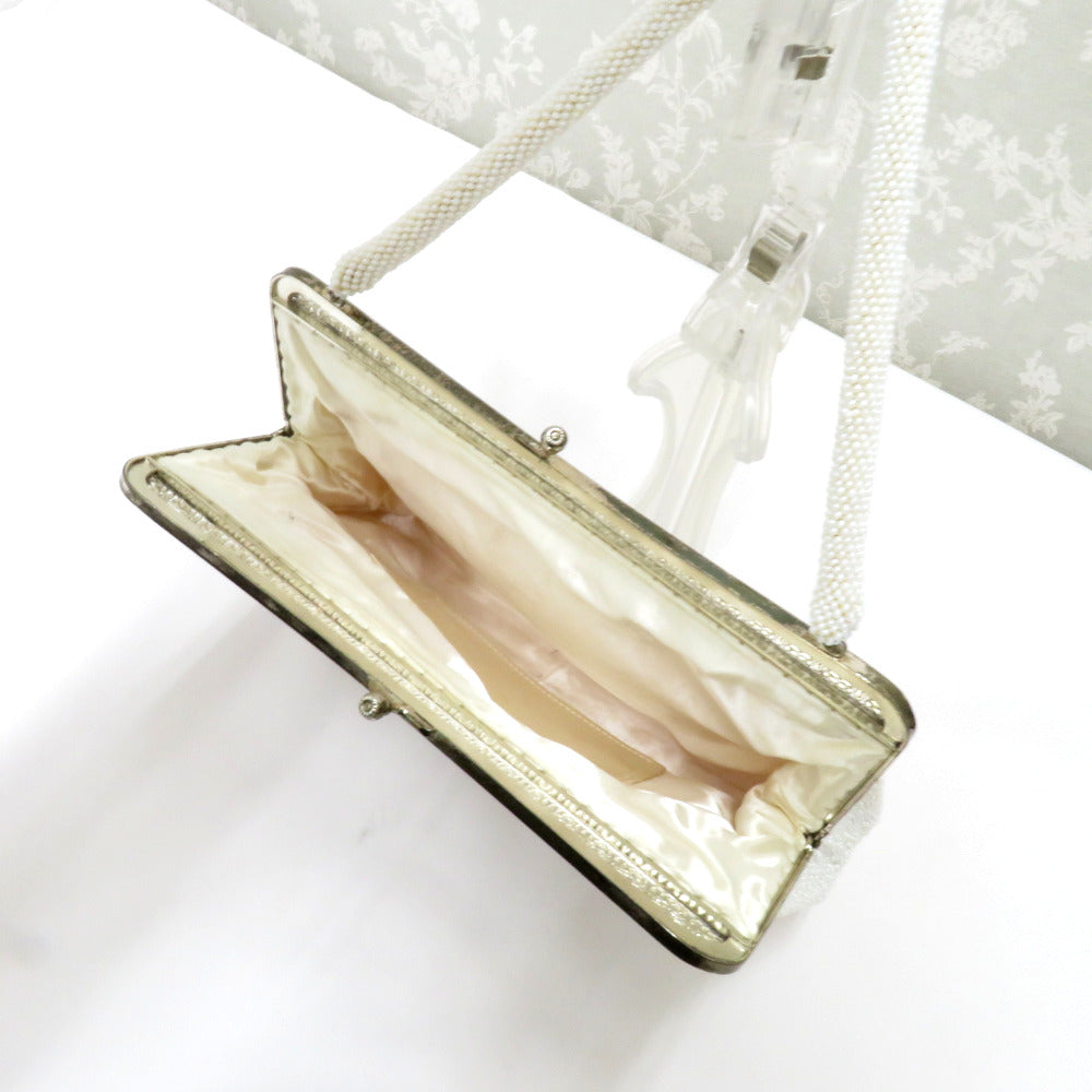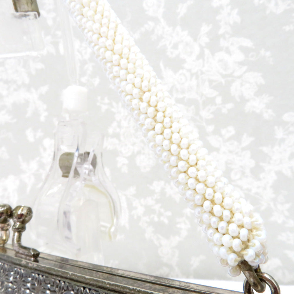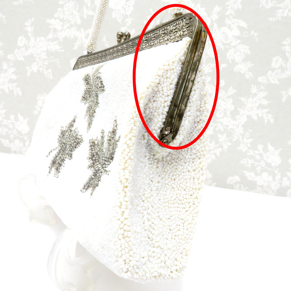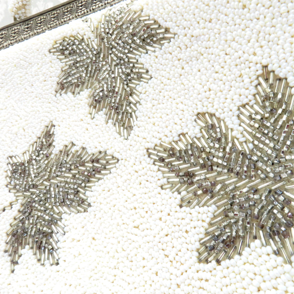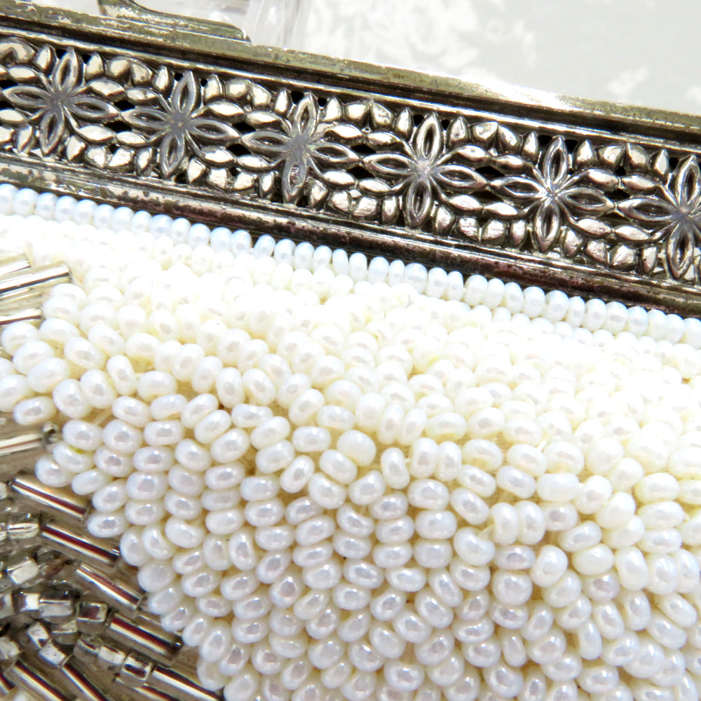 レトロでかわいいビーズバッグです。白ベースに銀色の葉模様や金具部分の花の透かし模様がステキ。