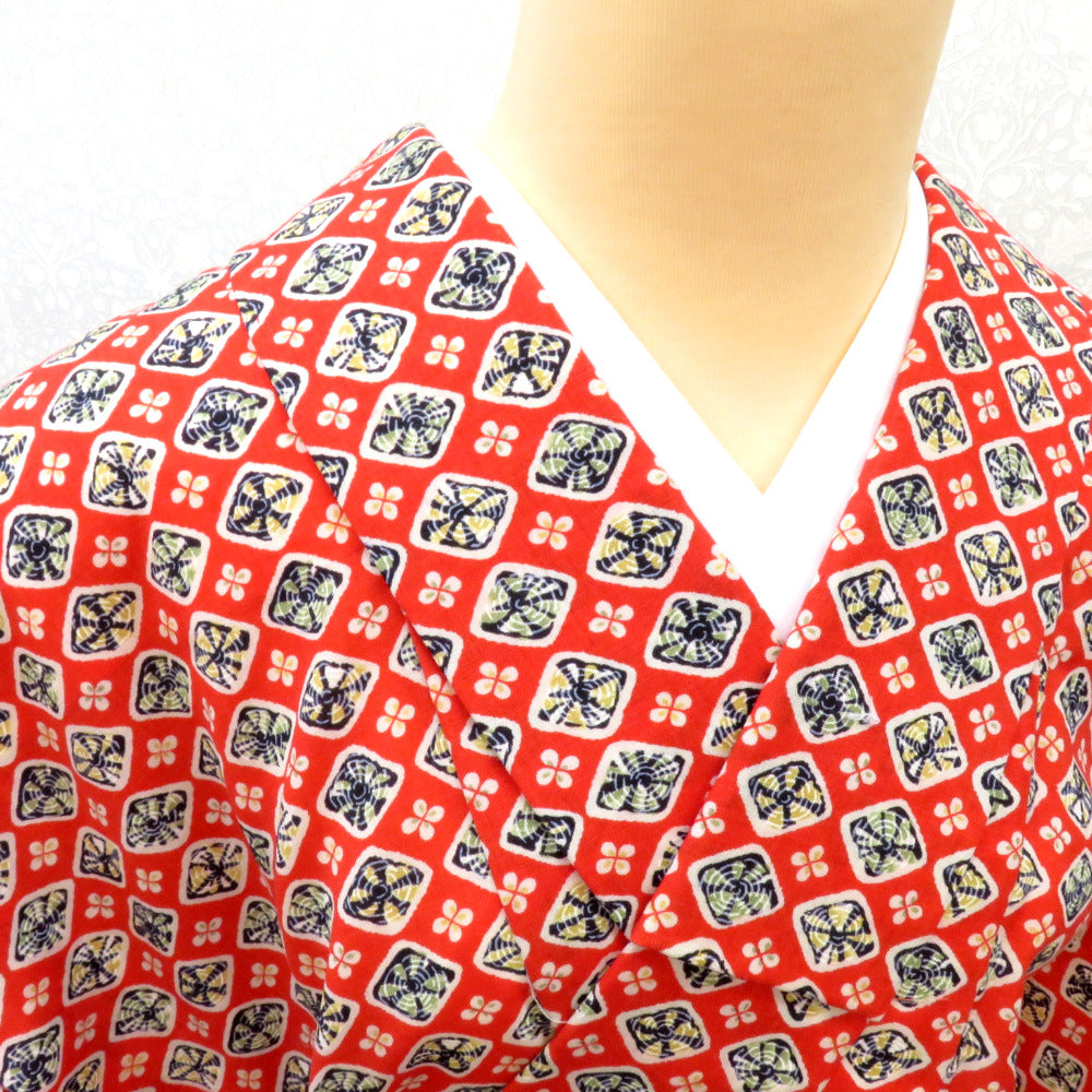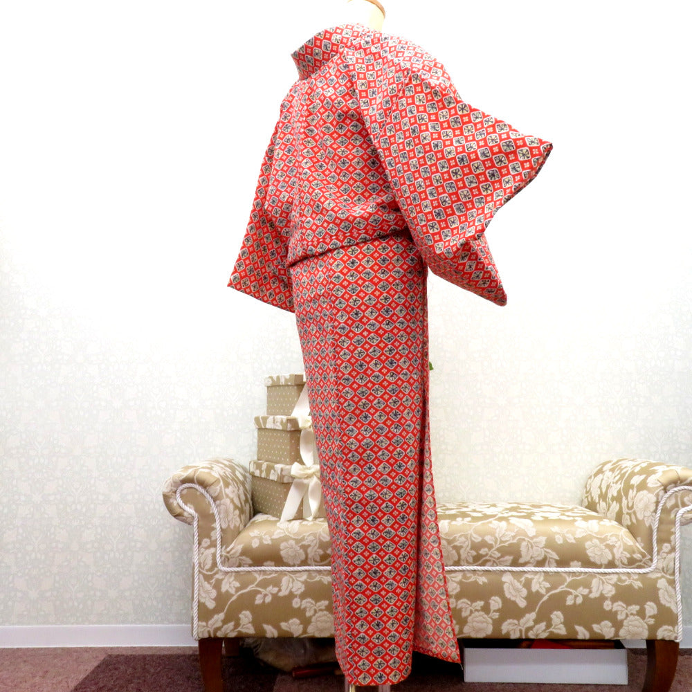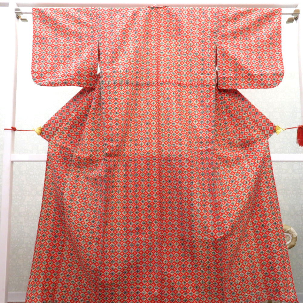ウール着物 単衣 オレンジ×白紺黄緑 菱花渦柄 バチ衿 カジュアルきもの 普段着物 仕立て上がり ウールきもの 和洋ミックス 身丈153.5cm